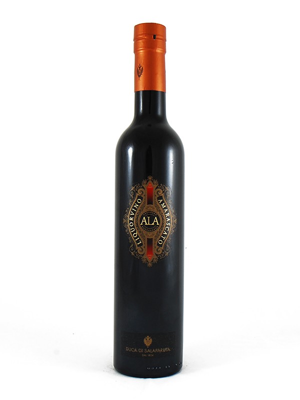 Ala Amarascato Duca di Salaparuta. Passito da 50 cl, dal corpo robusto e con aromi fruttati di mandorla e marasca. Gusto dolce e vellutato con un finale amarognolo ma piacevole.